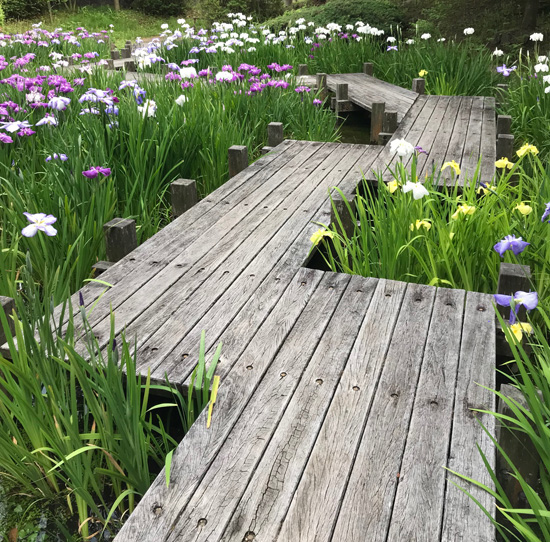 なぜ八つ橋が、そして杜若がここにあるのかは知りませんが、とにかくあるんです。光琳の「八つ橋図屏風」の世界がここに。季節も、ちょうど今頃。